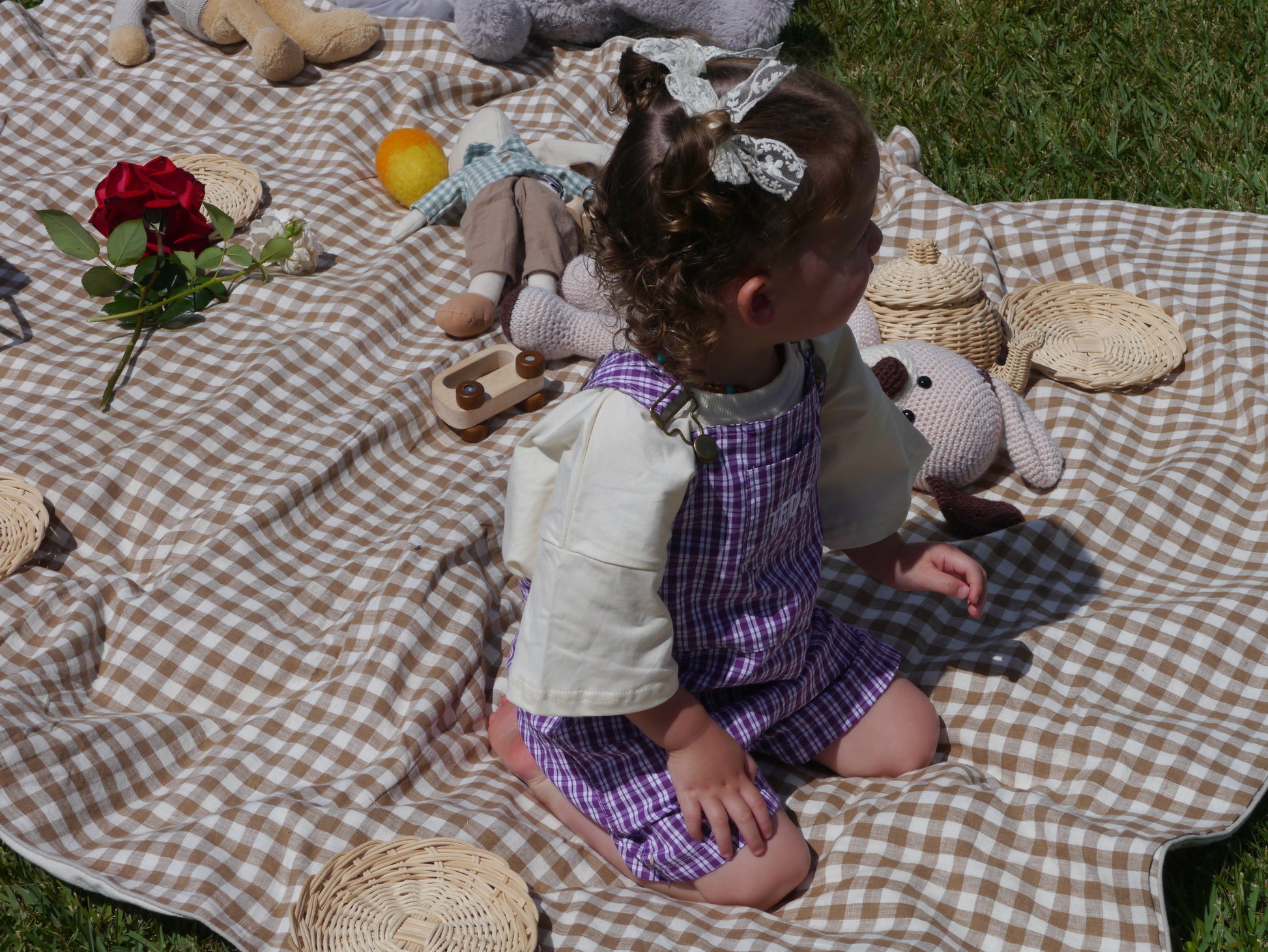Say hello to Paisley! Our soft purple gingham shortalls made for slow summer days and sweet flower picking adventures. Made from 100% lightweight cotton, Paisley is perfect for little ones who spend their afternoons gathering wild blooms, hosting teddy bear picnics in the shade, and watching the sky turn pastel at sunset. With a breezy fit and timeless charm, these shortalls are made for childhood moments filled with petals, play, and a little bit of magic.